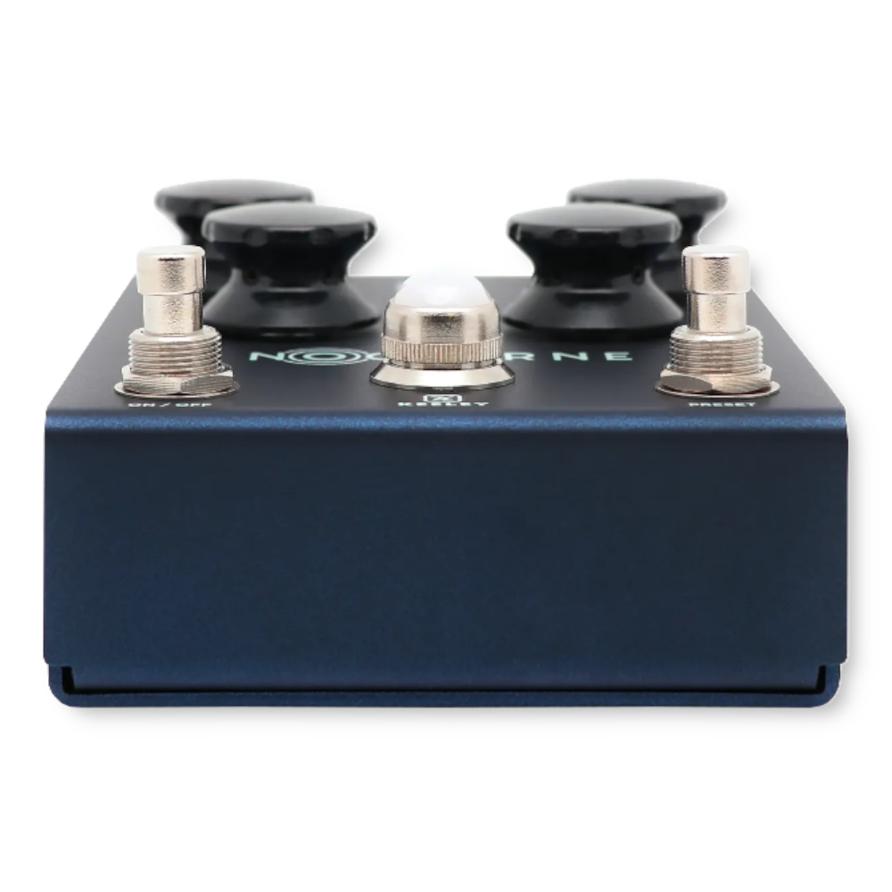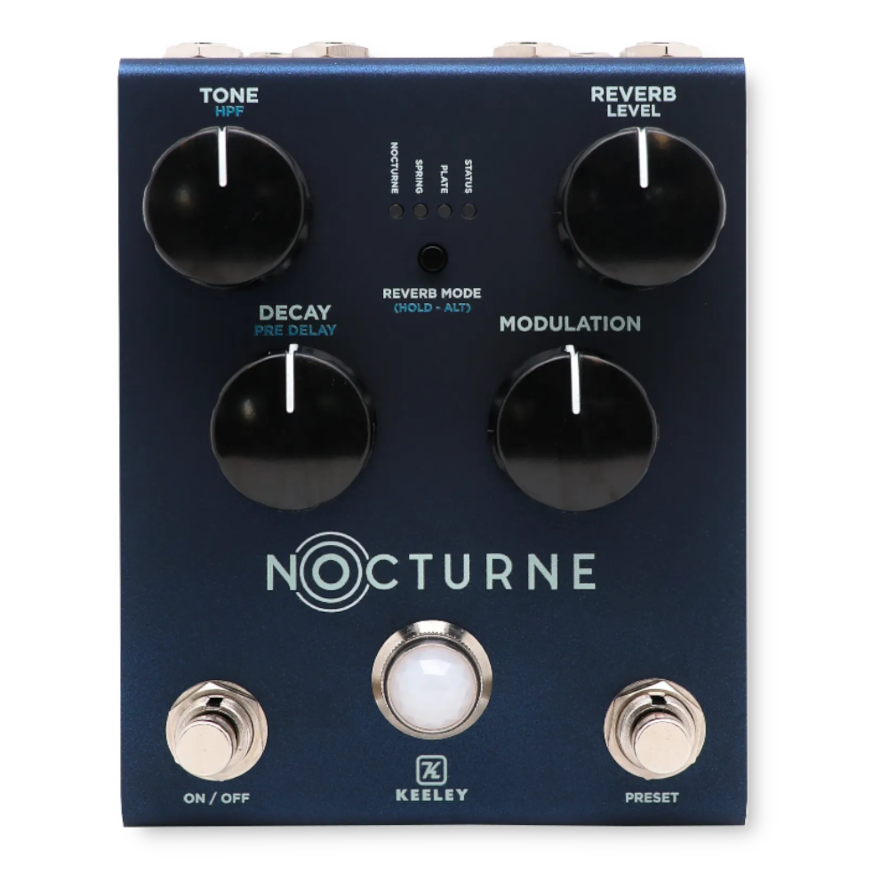 Developed by Keeley in collaboration with Andy Timmons, the NOCTURNE features a brand new reverb based on the unique Halo delay algorithm. From subtle ambiences to cinematic expanses, the NOCTURNE allows the player to create the same expressive, velocity-sensitive reverb that effortlessly follows every note without causing crosstalk from echoes. The NOCTURNE pedal offers three new reverb modes: Nocturne Reverb: Andy Timmons' Halo delay algorithm, reinterpreted as an ethereal, immersive reverb tail. Spring: Offers the best sounds based on both standalone reverbs and those from tube amp combos. Plate: Based on extensive analysis and modelling of the stereo tube plate reverb used at Austin City Limits Studio since the mid-1970s. The simple layout with four controls for tone, level, decay time and modulation makes it easy to shape any beautiful reverb. Each reverb mode can be saved as a preset. This includes the pre-delay time control, which allows you to create slapback echo effects. The NOCTURNE offers a flexible signal path with true or buffered bypass, expression pedal control, remote control and MIDI compatibility for up to 72 presets. Whether you use mono or stereo, wet/dry or full wet for parallel rigs, the NOCTURNE adapts easily to any setup. The Nocturne is easy to use: when the LED indicator lights up blue, use the controls to adjust the sound of each reverb mode. When the LED lights up red, it is a favourite or a preset where you can save the settings for each reverb mode.