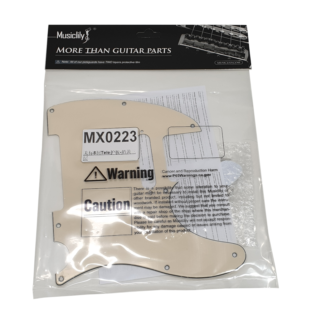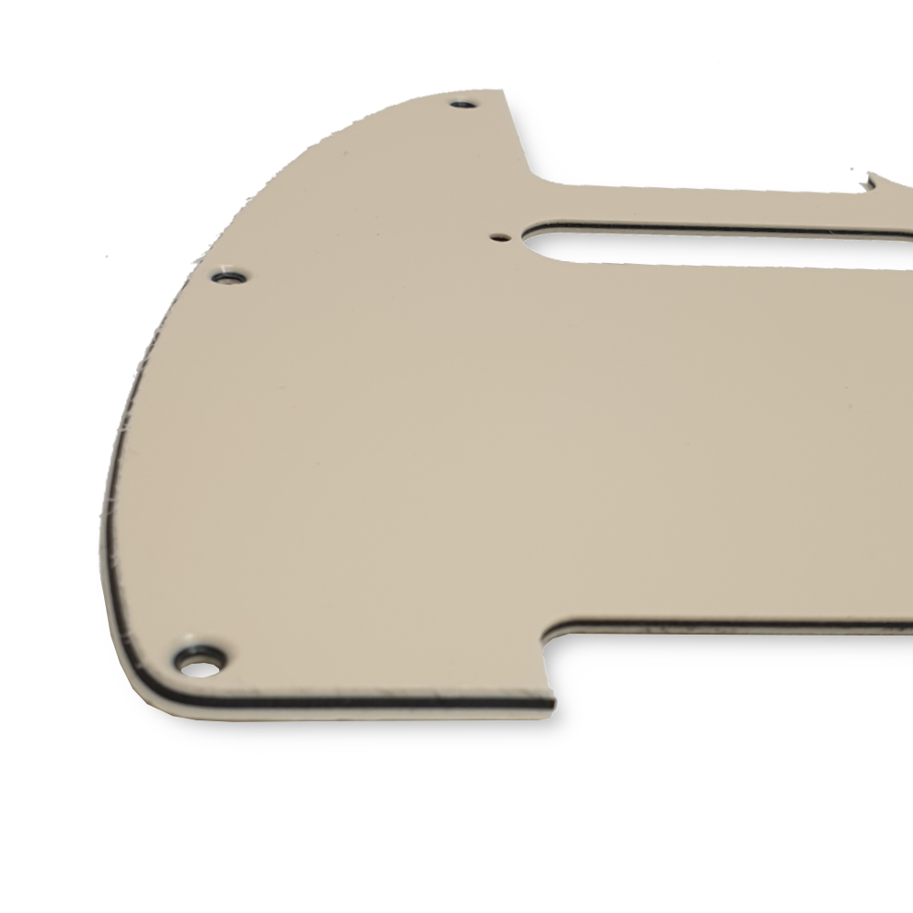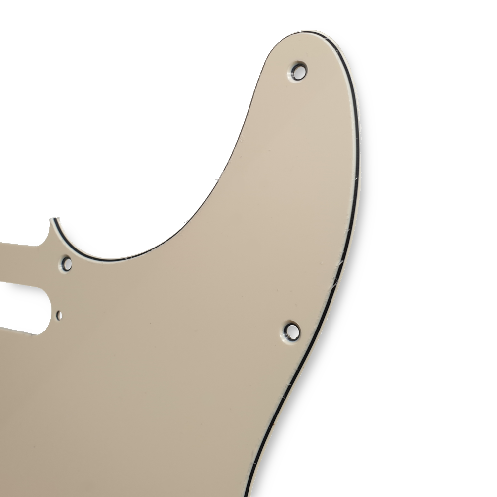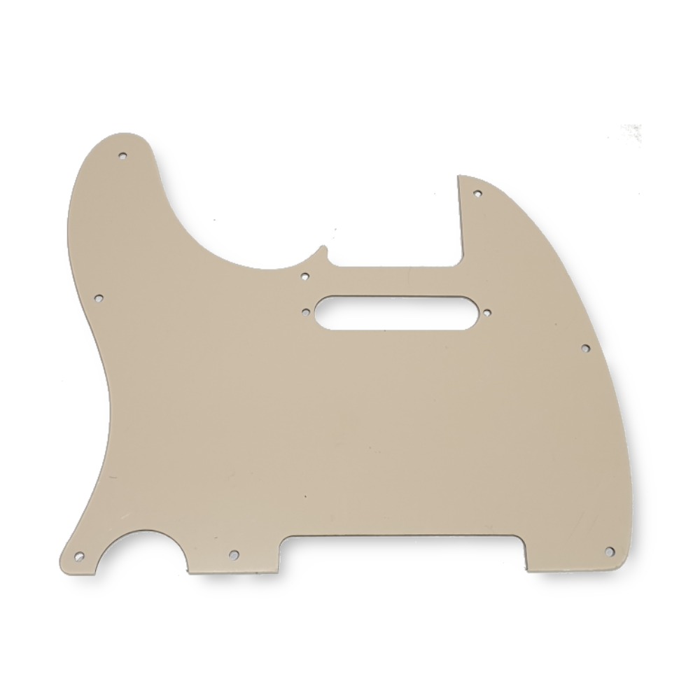 Standard pickguard for telecaster guitars, in 3-ply cream design, in standard pickup configuration. The pickguard has 8 mounting holes, compatible with Fender USA/Mexico models. Chrome pickguard screws are included.