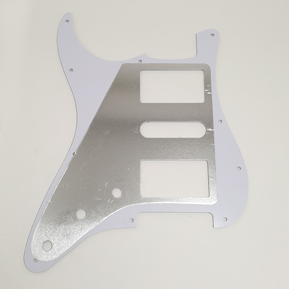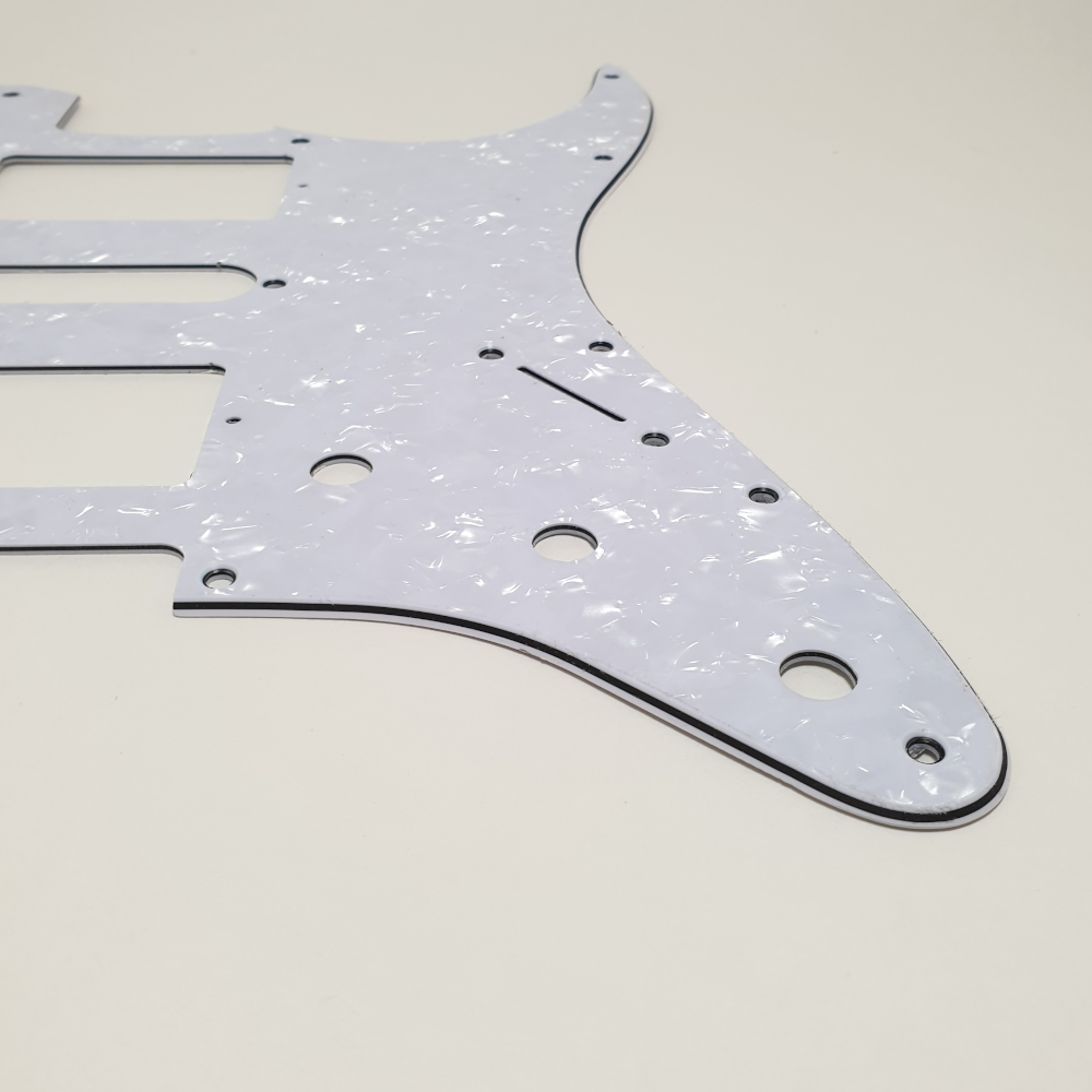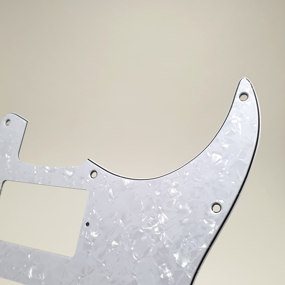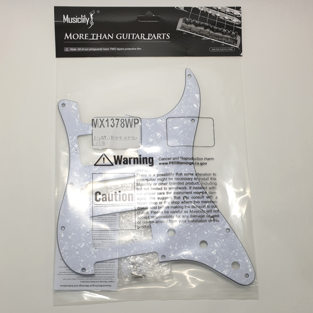 MusicLily MX1378 slagplaat voor stratocaster gitaar, in 4-ply white pearl uitvoering. De slagplaat is voorzien van 11 bevestigingsgaten, 3 potmeter gaten, uitsparing voor standen switch. In de slagplaat kunnen 2 humbuckers en 1 single coil gemonteerd worden. De slagplaat past op Fender USA/Mexico made standard modern style stratocasters. Er worden chrome schroeven voor montage van de slagplaat meegeleverd.