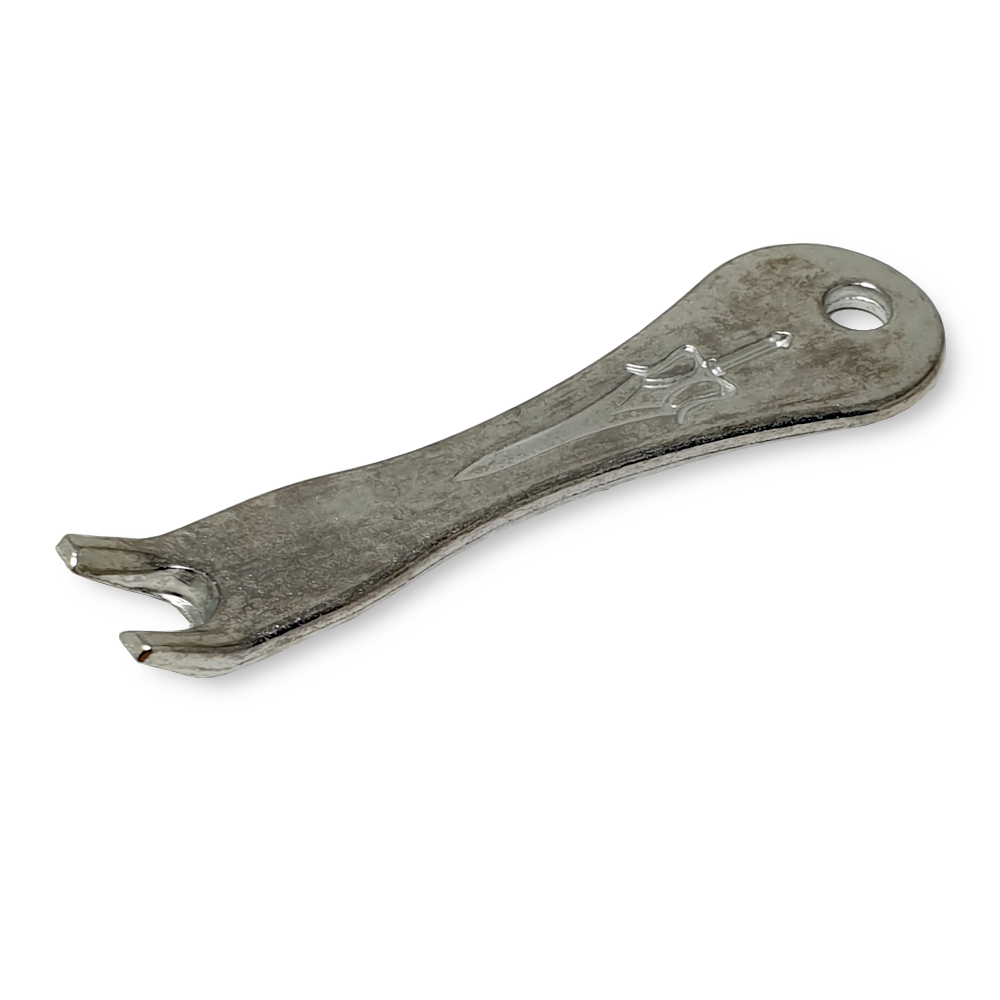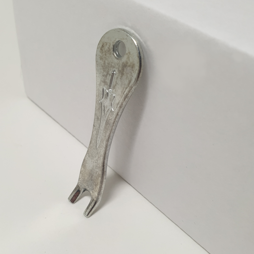 A handy tool to remove bridge pins on acoustic guitars, made of engraved metal.