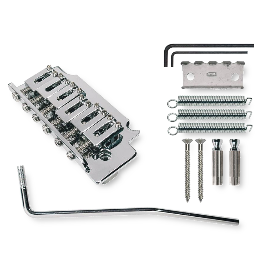 Boston T-260-C tremolo set in chrome uitvoering. Compleet 2-point tremolo systeem met modern style brugzadels, en verstelbare studs.