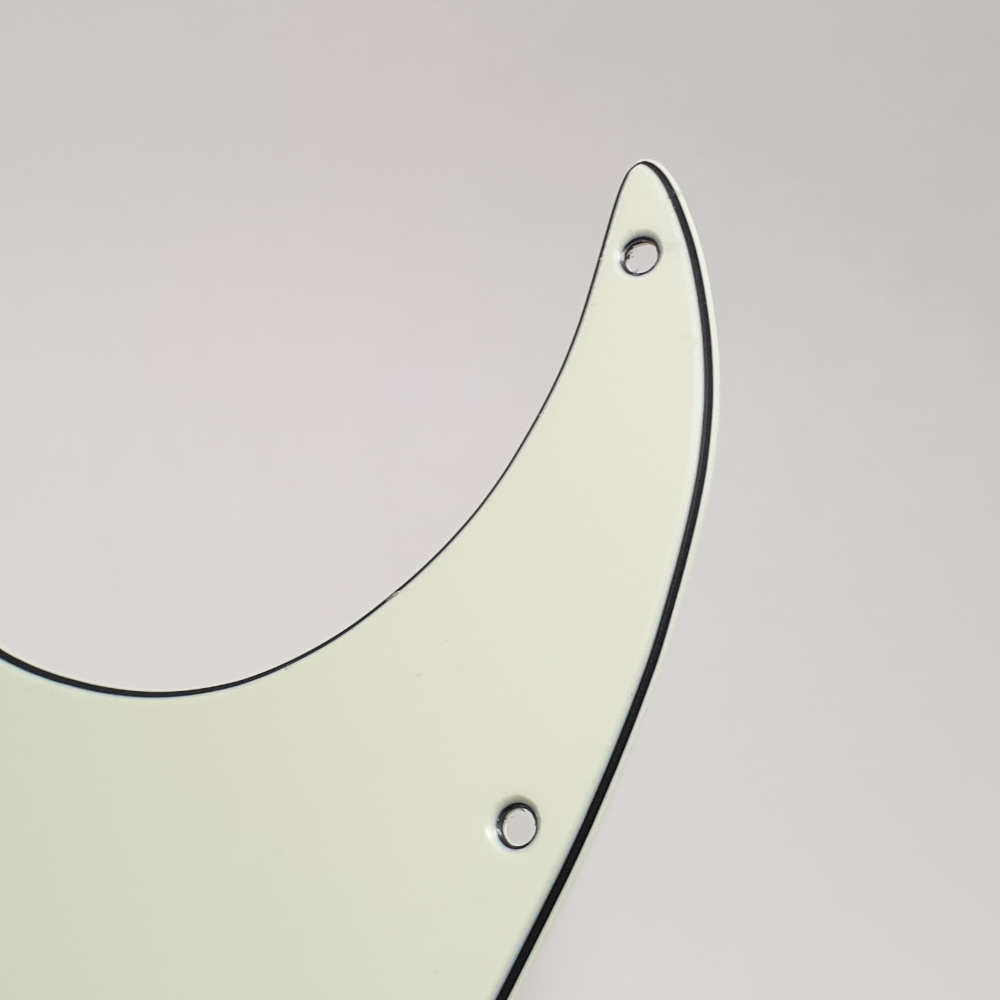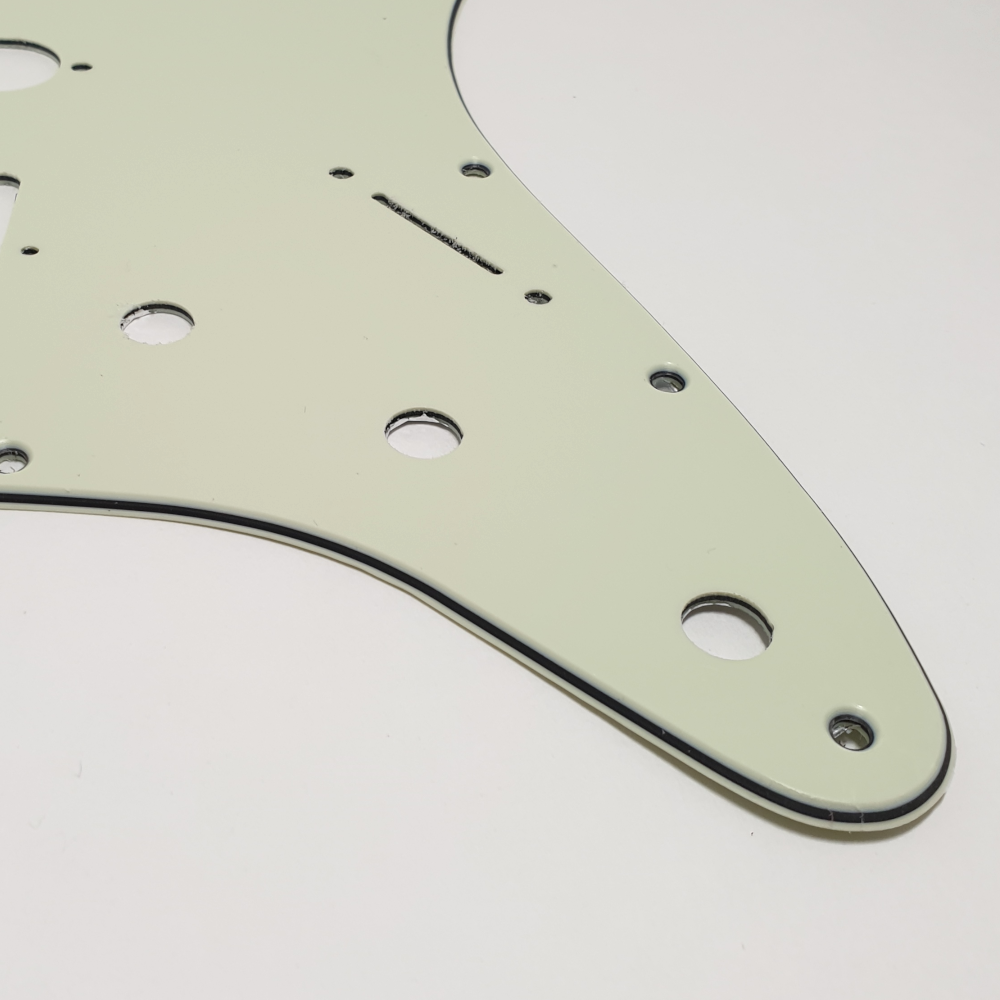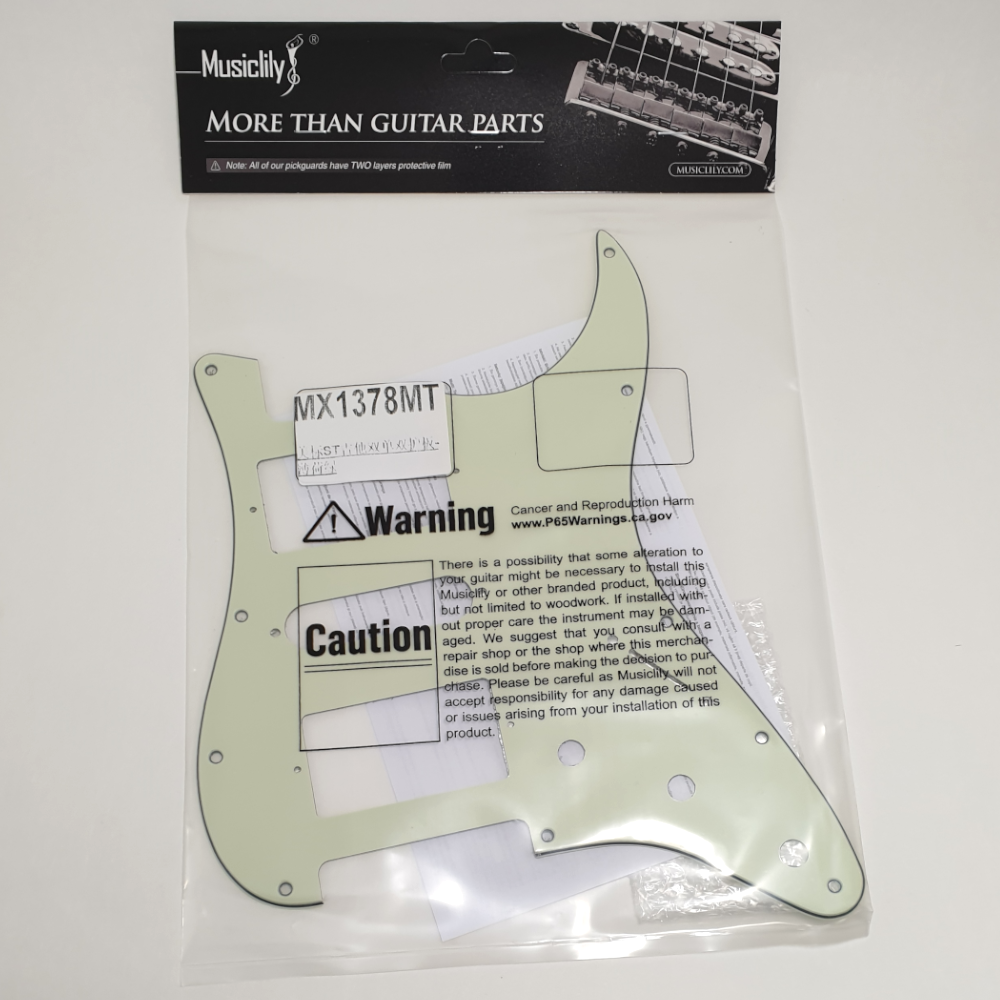 MusicLily MX1378 slagplaat voor stratocaster gitaar, in 3-ply mint green uitvoering. De slagplaat is voorzien van 11 bevestigingsgaten, 3 potmeter gaten, uitsparing voor standen switch. In de slagplaat kunnen 2 humbuckers en 1 single coil gemonteerd worden. De slagplaat past op Fender USA/Mexico made standard modern style stratocasters. Er worden chrome schroeven voor montage van de slagplaat meegeleverd.