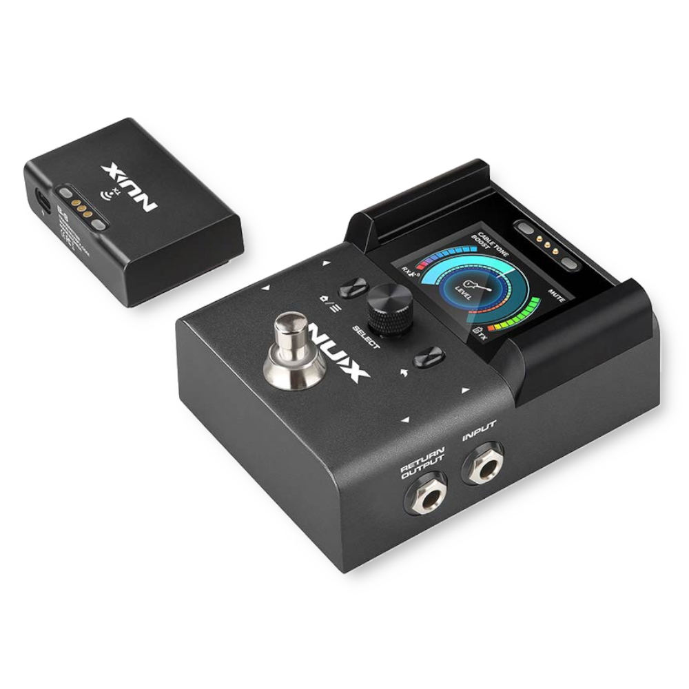 De NUX B-8 is een 2,4 Ghz draadloos systeem voor gitaar, basgitaar en andere instrumenten met elektronische pickups. Het systeem kan max. 50 mtr overbruggen, de zender kan op de ontvanger-unit opgeladen worden, met een geladen batterij kan ongeveer 6 uur gespeeld worden. De ontvanger unit heeft een duidelijke tuner, een boost functie, een DI output en diverse aansluitingen voor verschillende setups.
